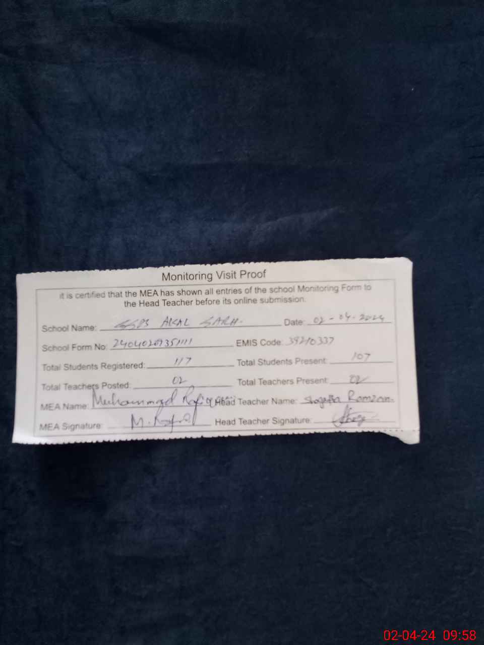 | Attendance Register | Head Teacher | MEA with School | Visit Proof |