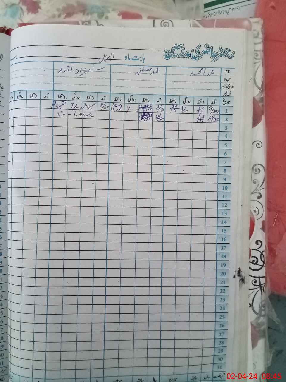 | CNIC | Full Name | Designation | R/C | Absence During Last Calender Month |