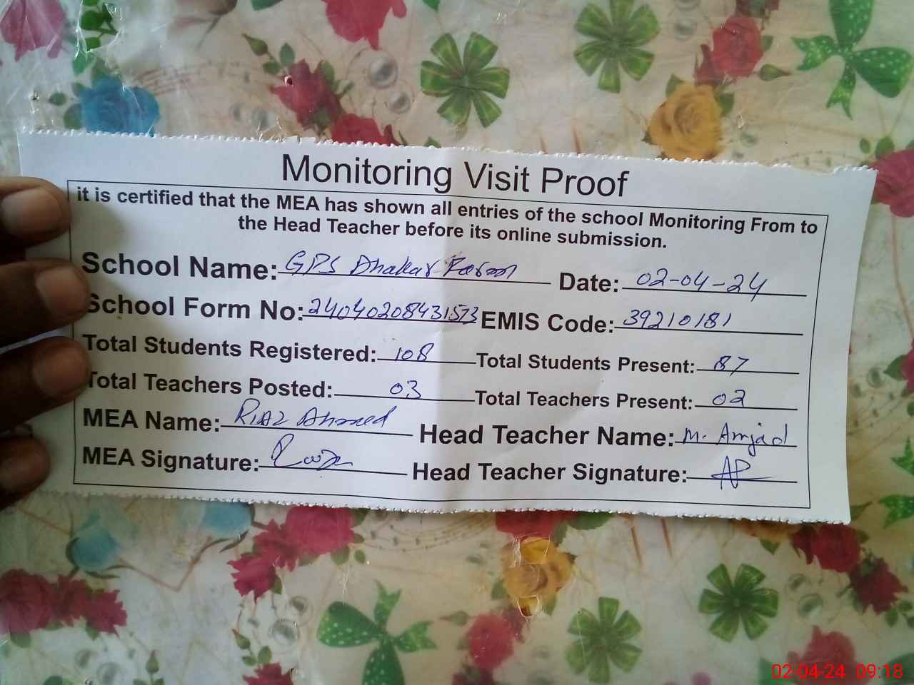 | Attendance Register | Head Teacher | MEA with School | Visit Proof |