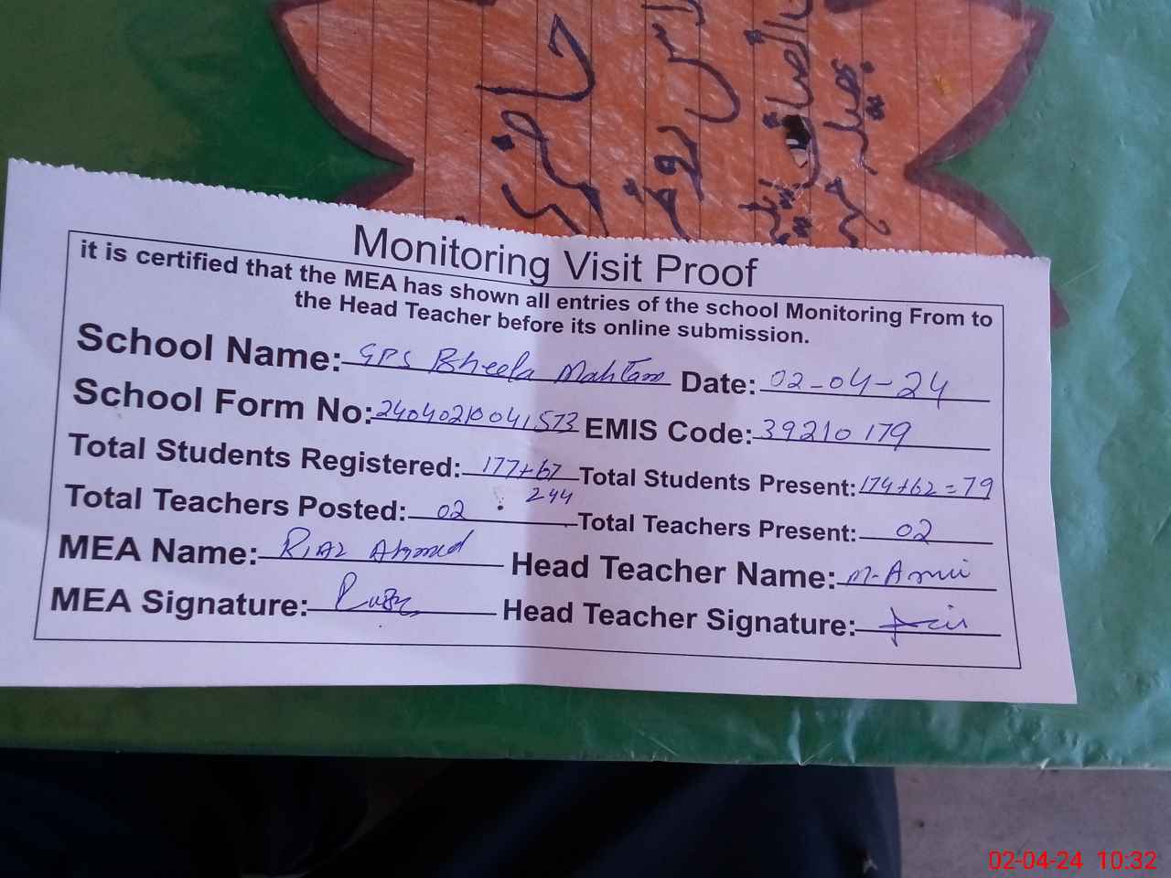 | Attendance Register | Head Teacher | MEA with School | Visit Proof |