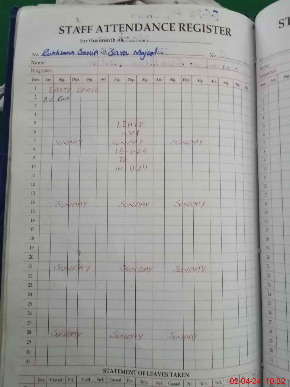| 35**** | Sa**** Ma**** | PST | Regular | 31 | 0 | 0 | 31 | 0 | 0 | 0 | 0 | 0 | Maternity |