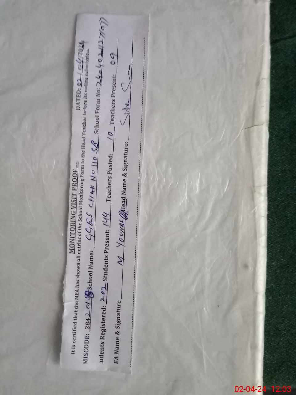 | Attendance Register | Head Teacher | MEA with School | Visit Proof |