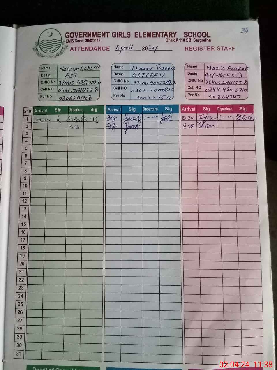 | CNIC | Full Name | Designation | R/C | Absence During Last Calender Month |