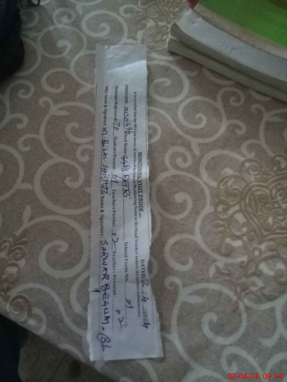 | Attendance Register | Head Teacher | MEA with School | Visit Proof |