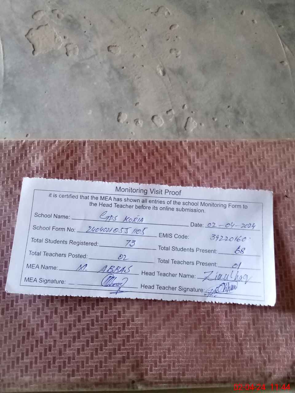 | EMIS Code: 39220162 | Name of School: GPS KORIA | |||
