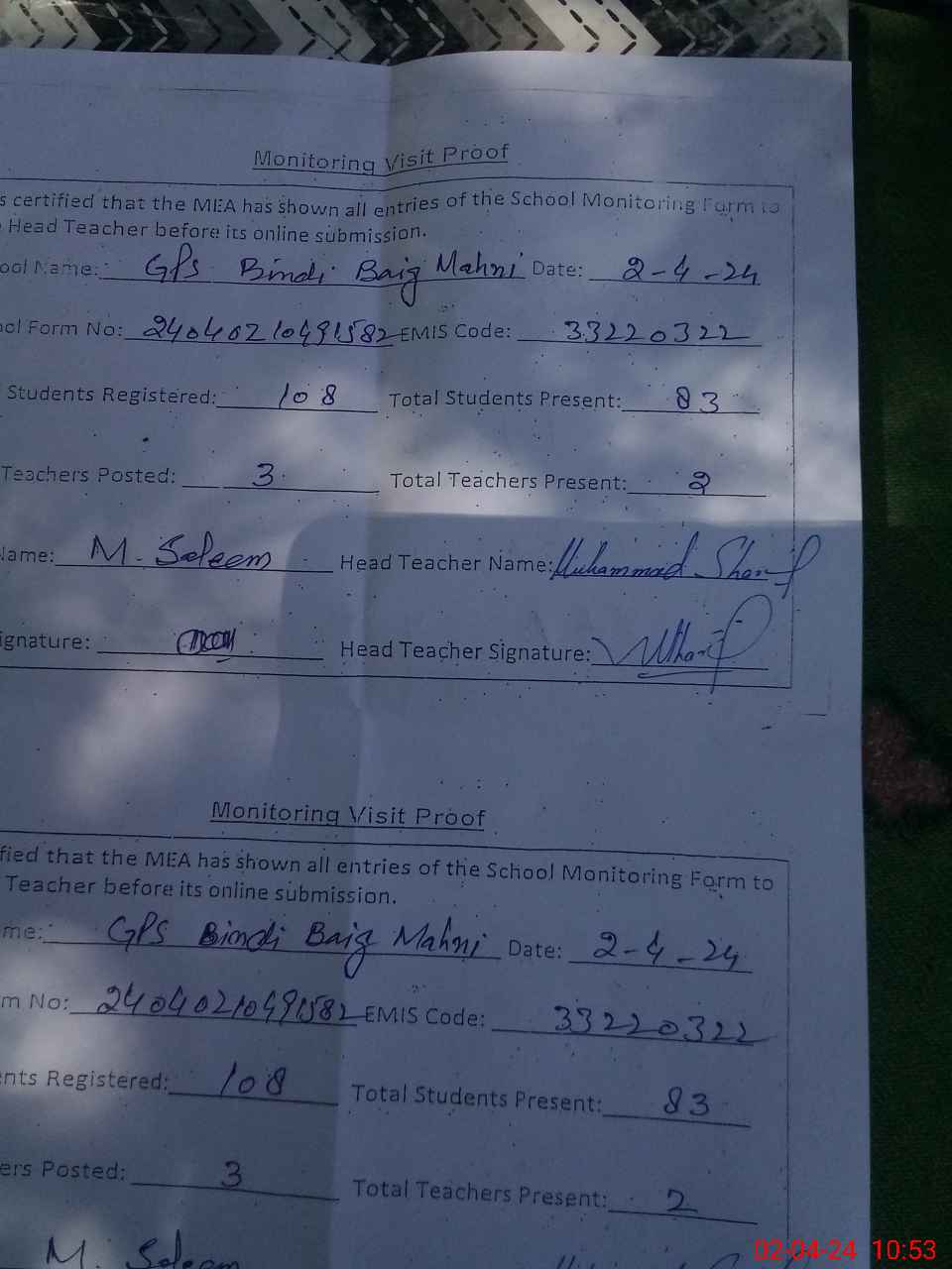 | EMIS Code: 33220322 | Name of School: GPS BINDI BAIG MAHNI | |||