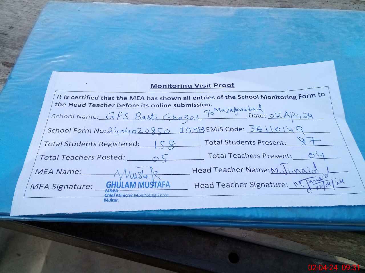 | Attendance Register | Head Teacher | MEA with School | Visit Proof |