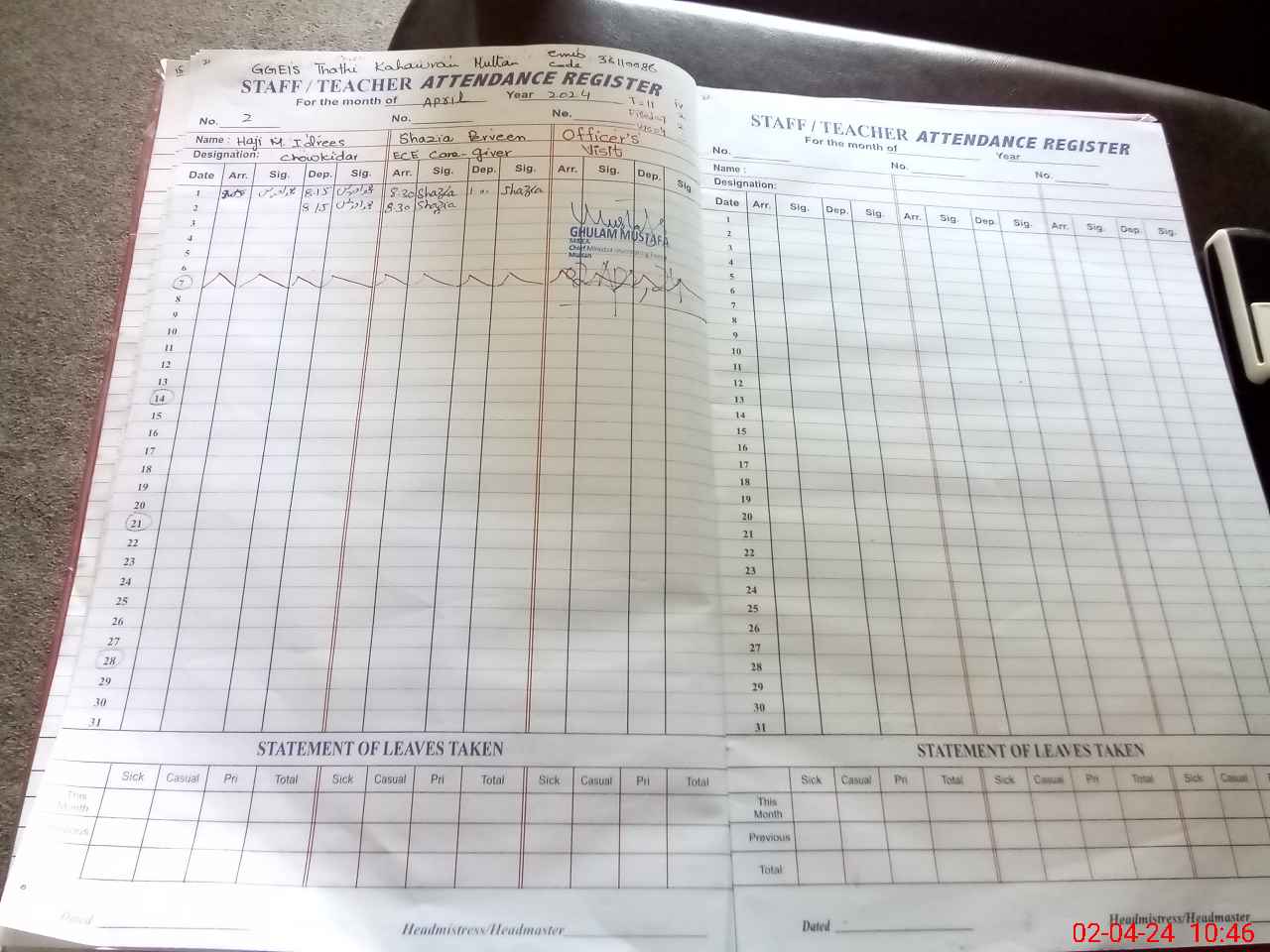 | Attendance Register | Head Teacher | MEA with School | Visit Proof |