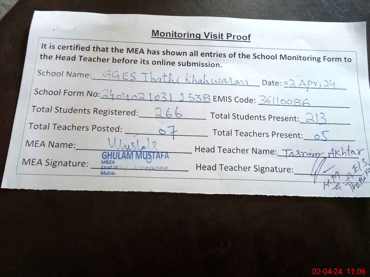 | Monitoring Date: 02-04-2024 | Start Time: 02-04-2024 10:31 AM | End Time: 02-04-2024 11:09 AM | Name of MEA: Gh**** Mu**** | |