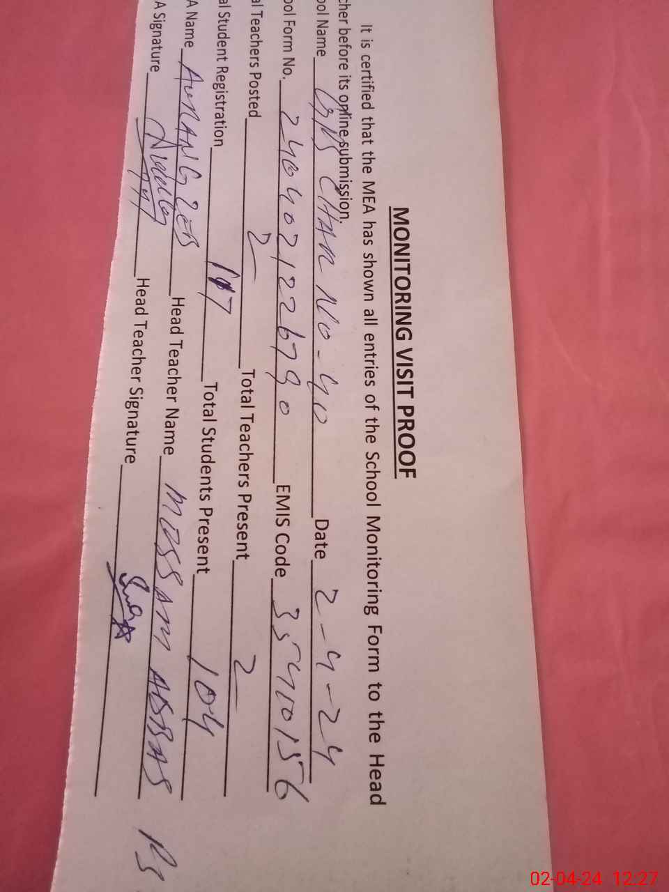 | Attendance Register | Head Teacher | MEA with School | Visit Proof |