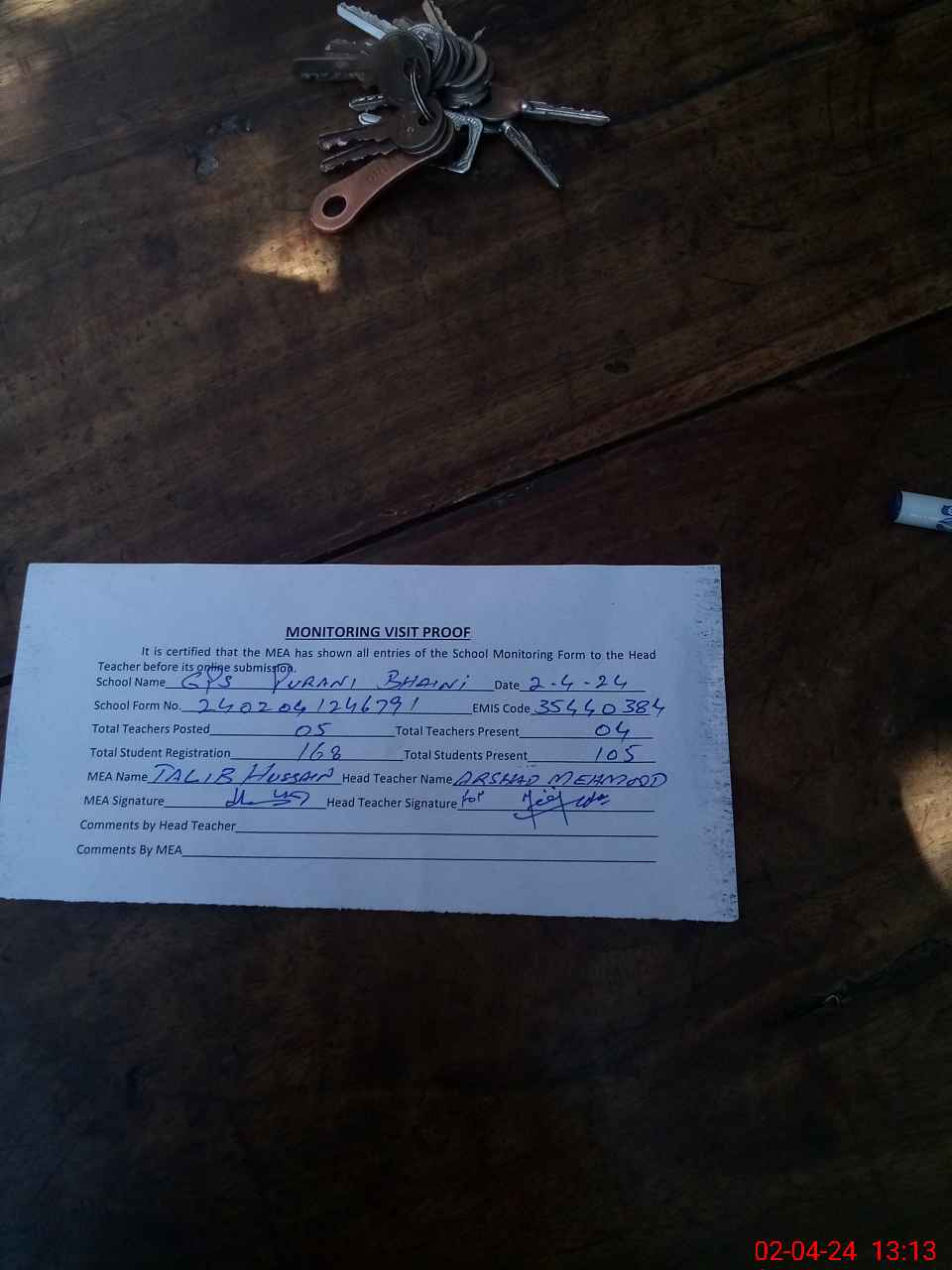 | Attendance Register | Head Teacher | MEA with School | Visit Proof |
