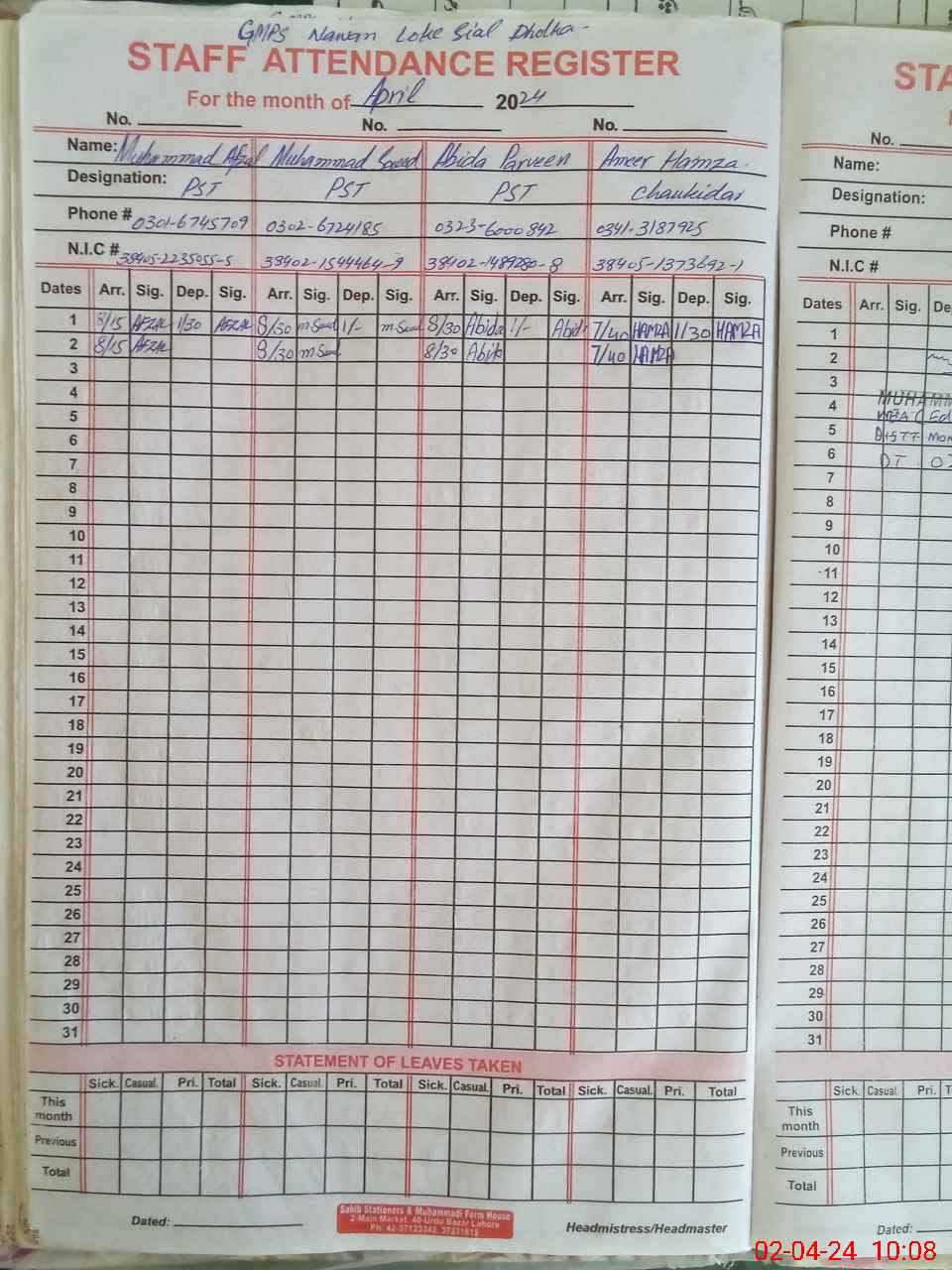 | CNIC | Full Name | Designation | R/C | Absence During Last Calender Month |