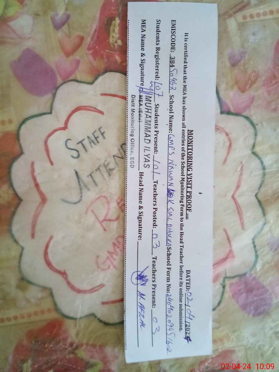 | Certified that this School was Inspected by the Undersigned MEA/DMO Today and the Information Stated Above is as Per Record. | |||||
