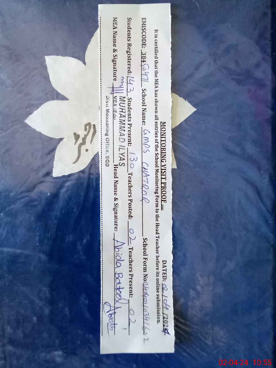 | Attendance Register | Head Teacher | MEA with School | Visit Proof |