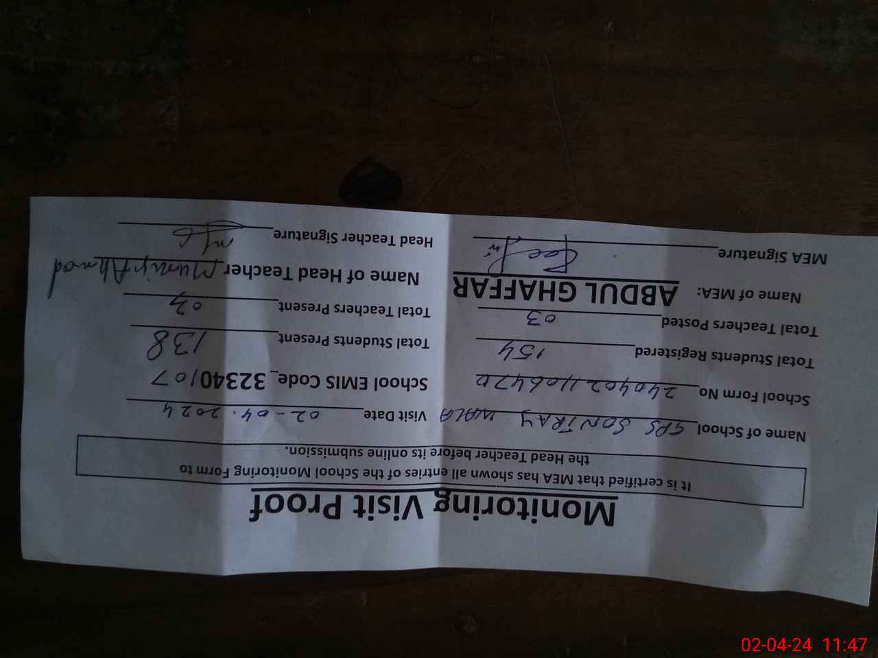 | EMIS Code: 32340107 | Name of School: GPS SONTRAY WALA | |||