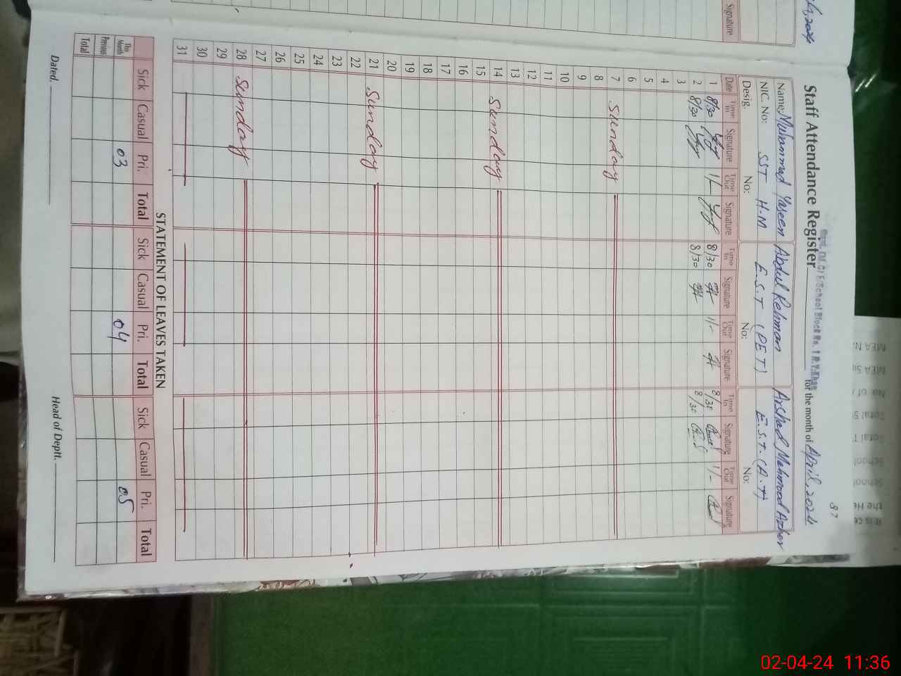 | CNIC | Full Name | Designation | R/C | Absence During Last Calender Month |
