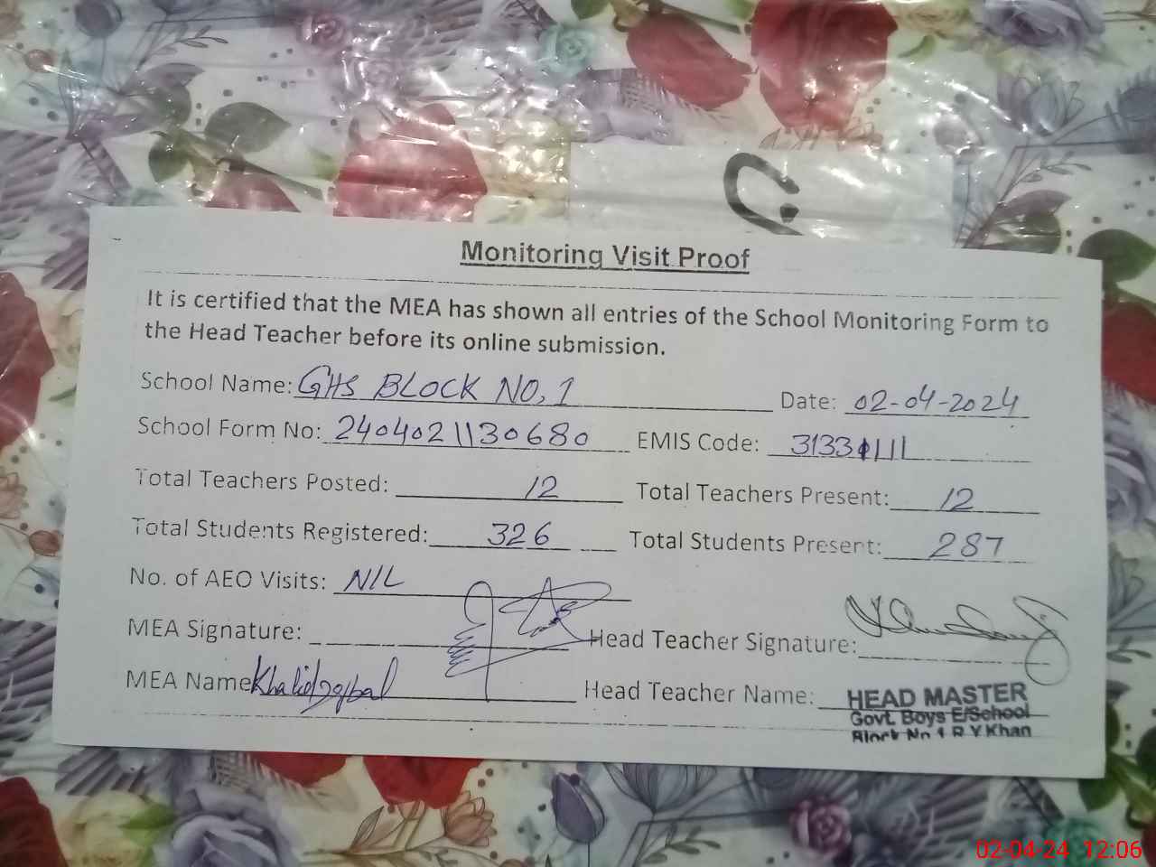 | Attendance Register | Head Teacher | MEA with School | Visit Proof |
