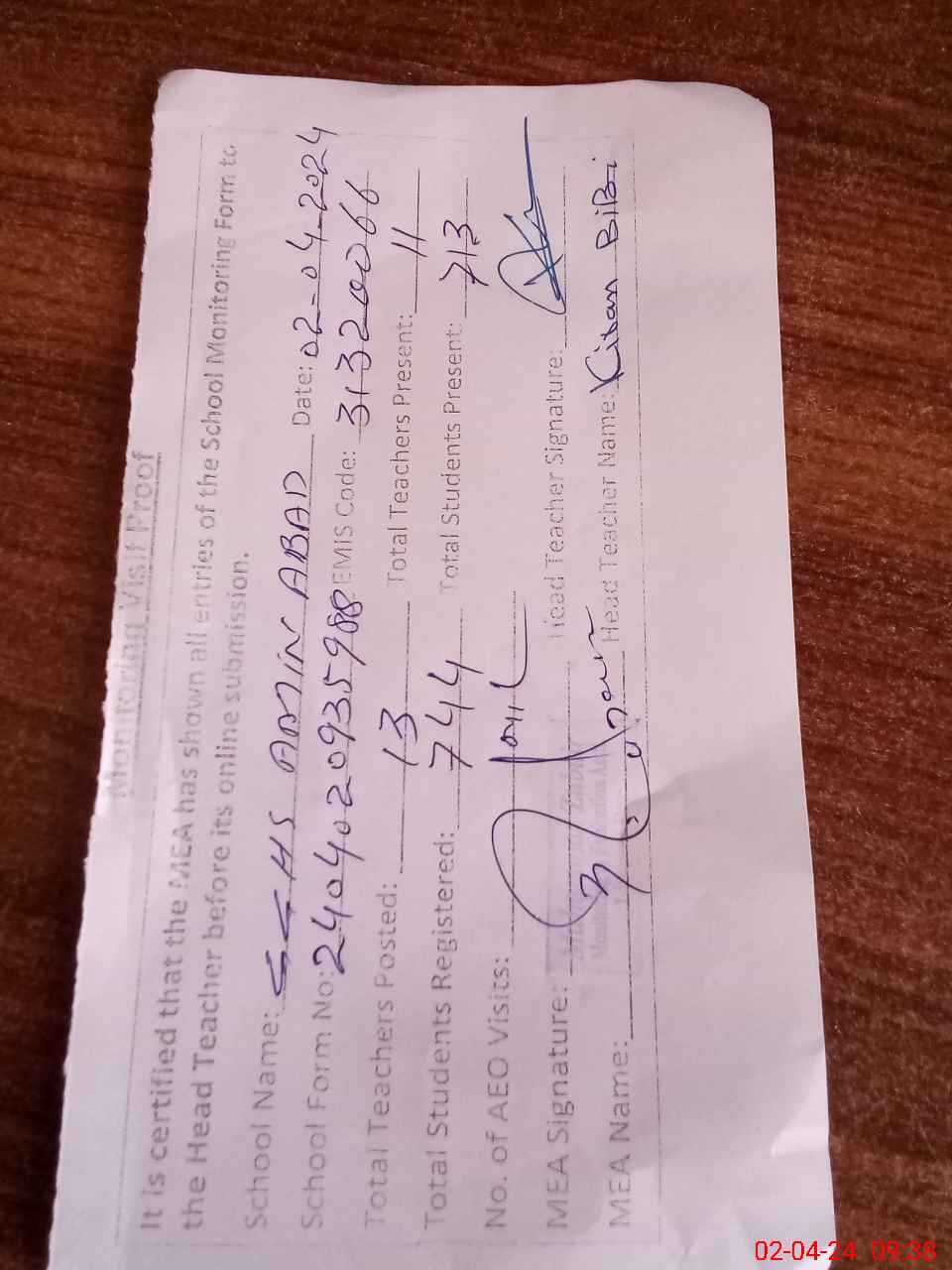 | Attendance Register | Head Teacher | MEA with School | Visit Proof |