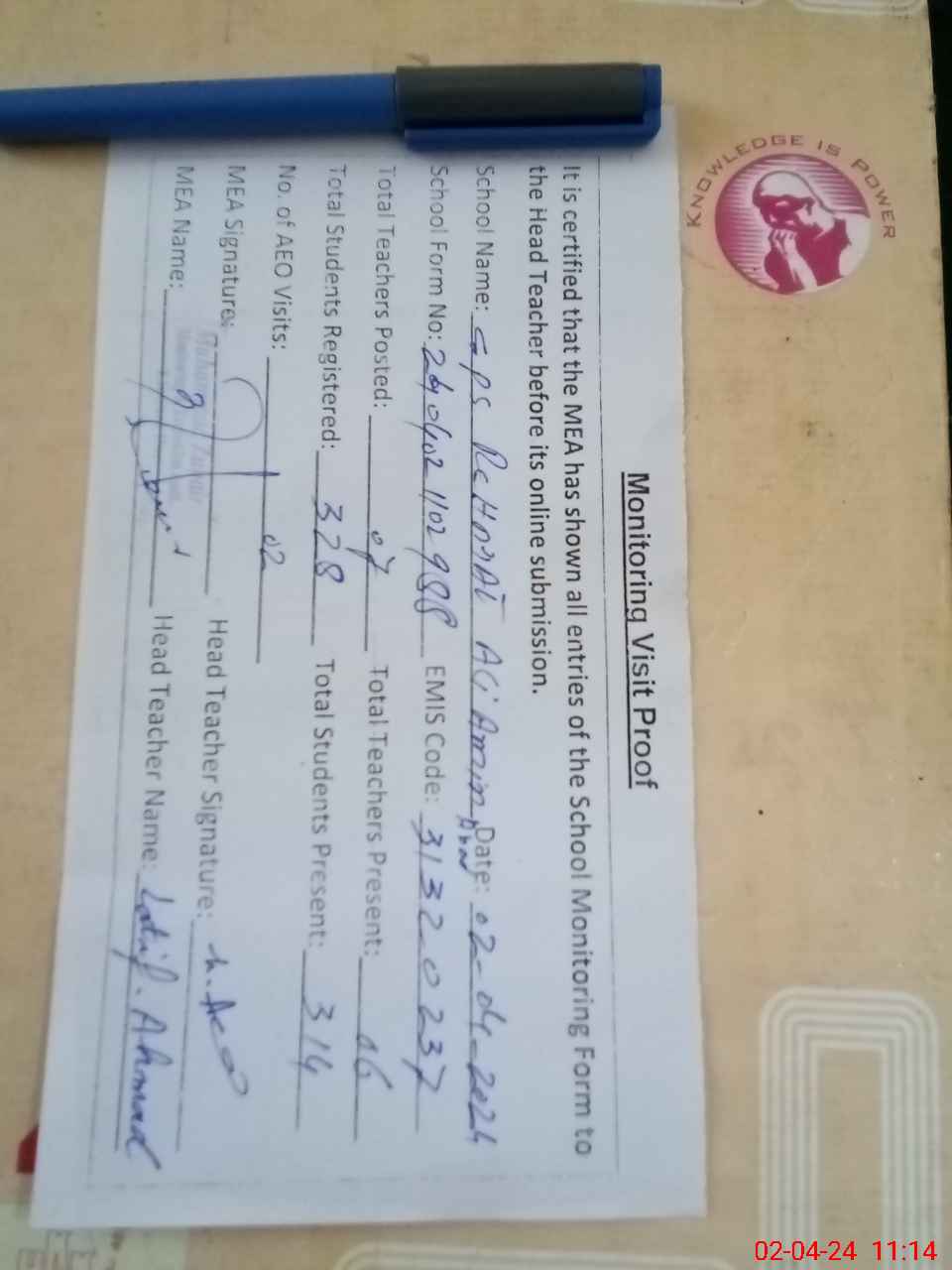 | EMIS Code: 31320237 | Name of School: GPS REHMAT ALI AMIN ABAD | |||