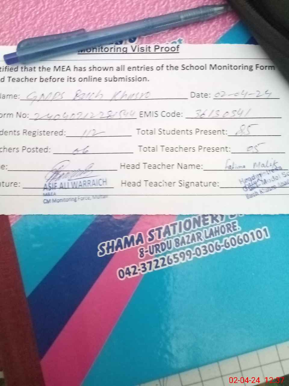 | Attendance Register | Head Teacher | MEA with School | Visit Proof |