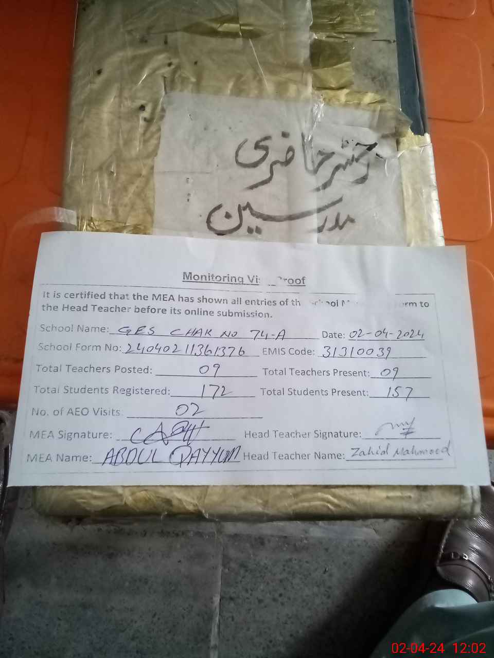 | Attendance Register | Head Teacher | MEA with School | Visit Proof |