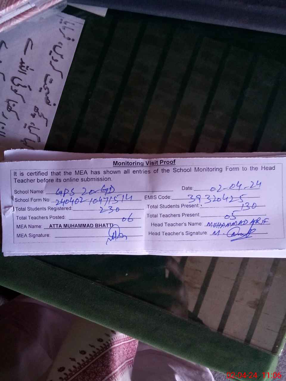| EMIS Code: 39320425 | Name of School: GPS CHAK NO. 20/G.D | |||