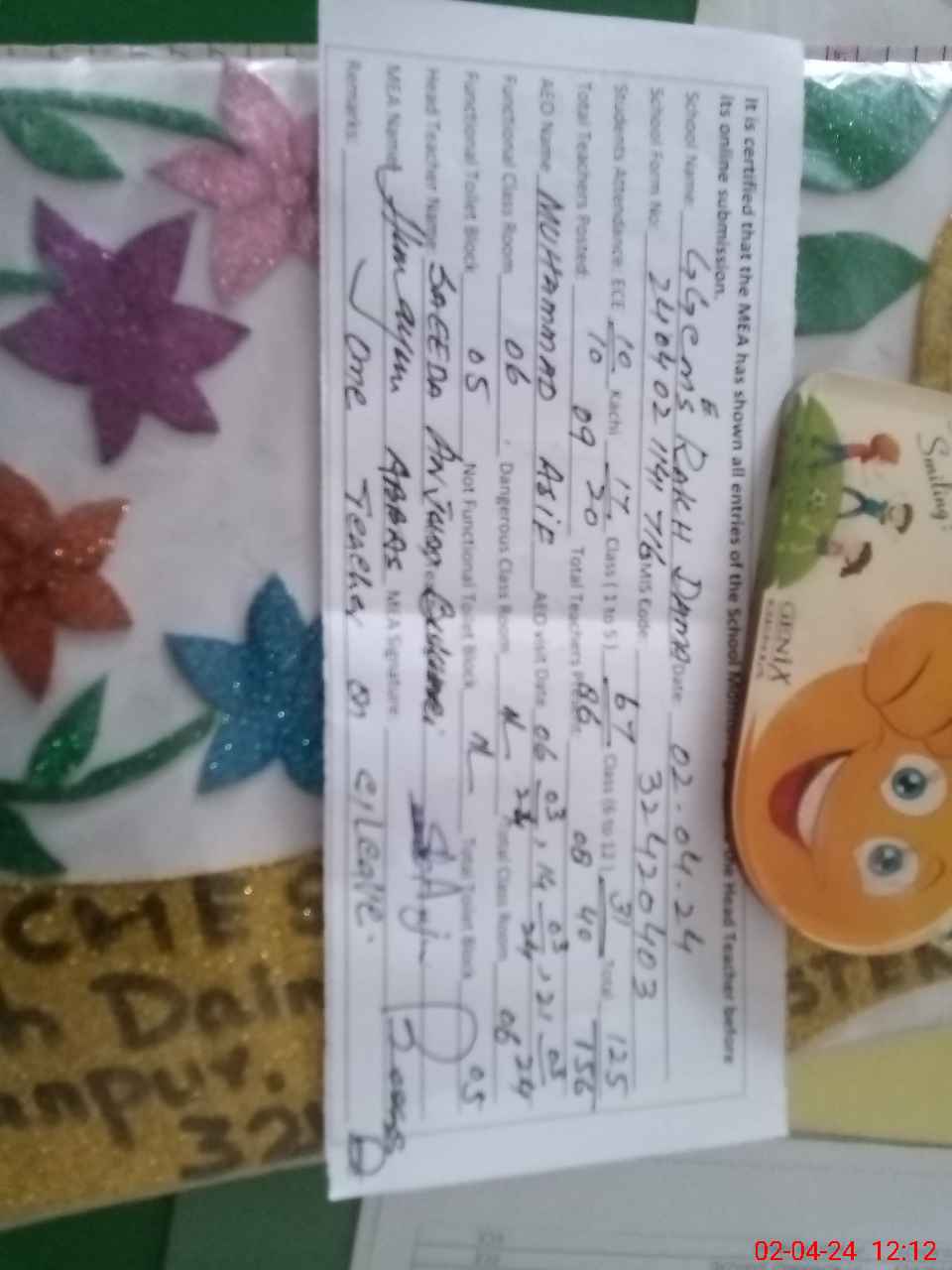 | Remarks (Use Separate Page if Required): ONE teacher on casual leave overall cleaness good | |||||