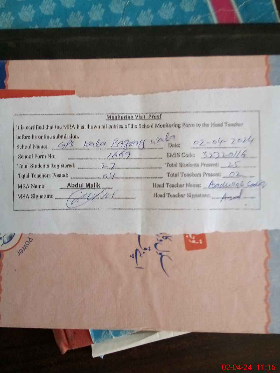 | EMIS Code: 32320116 | Name of School: GPS KALA BAGRAY WALA | |||