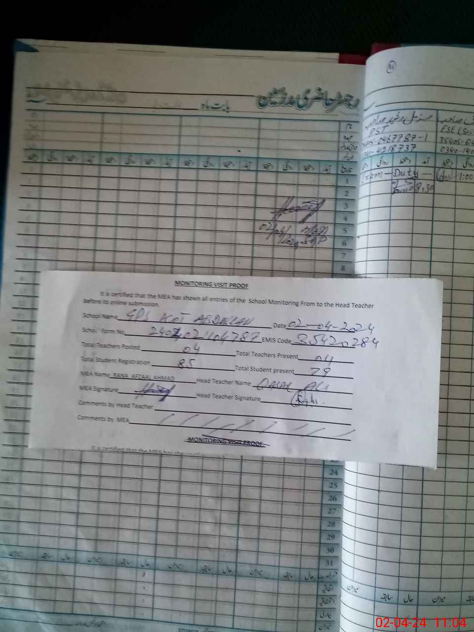 | Attendance Register | Head Teacher | MEA with School | Visit Proof |