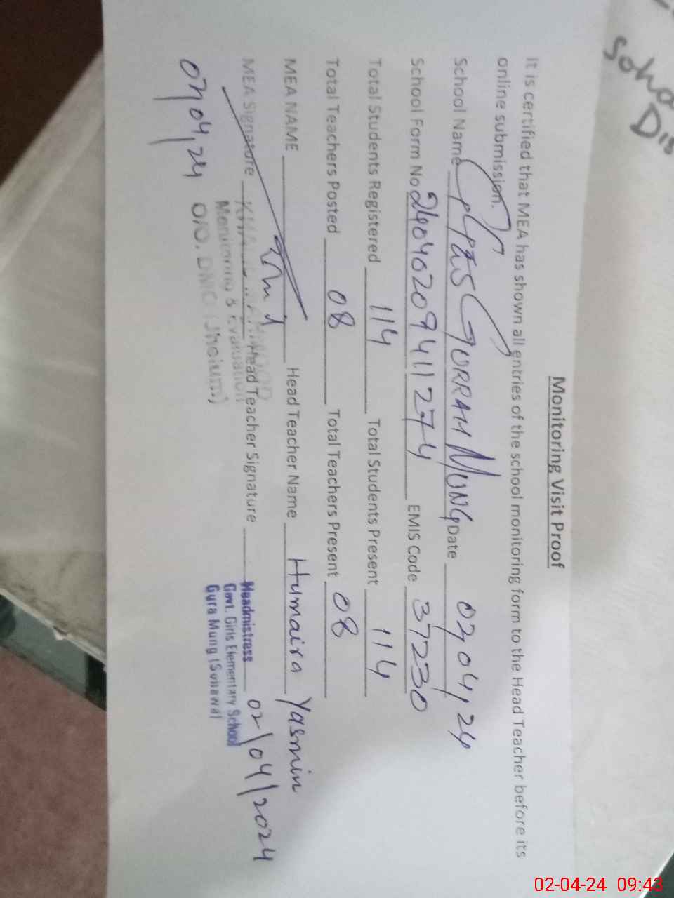 | Attendance Register | Head Teacher | MEA with School | Visit Proof |