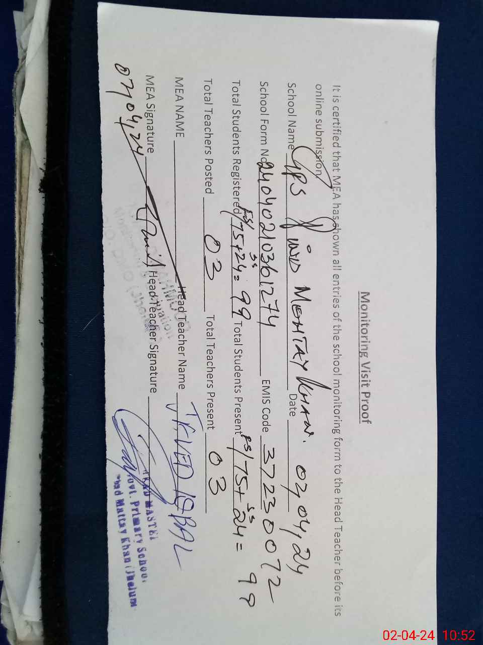 | Attendance Register | Head Teacher | MEA with School | Visit Proof |