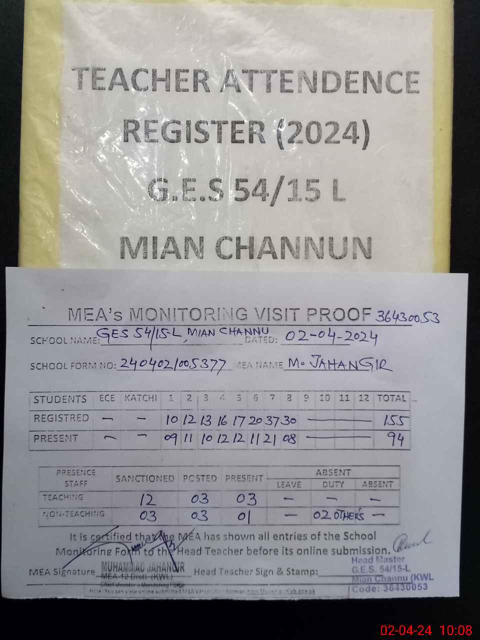 | Attendance Register | Head Teacher | MEA with School | Visit Proof |