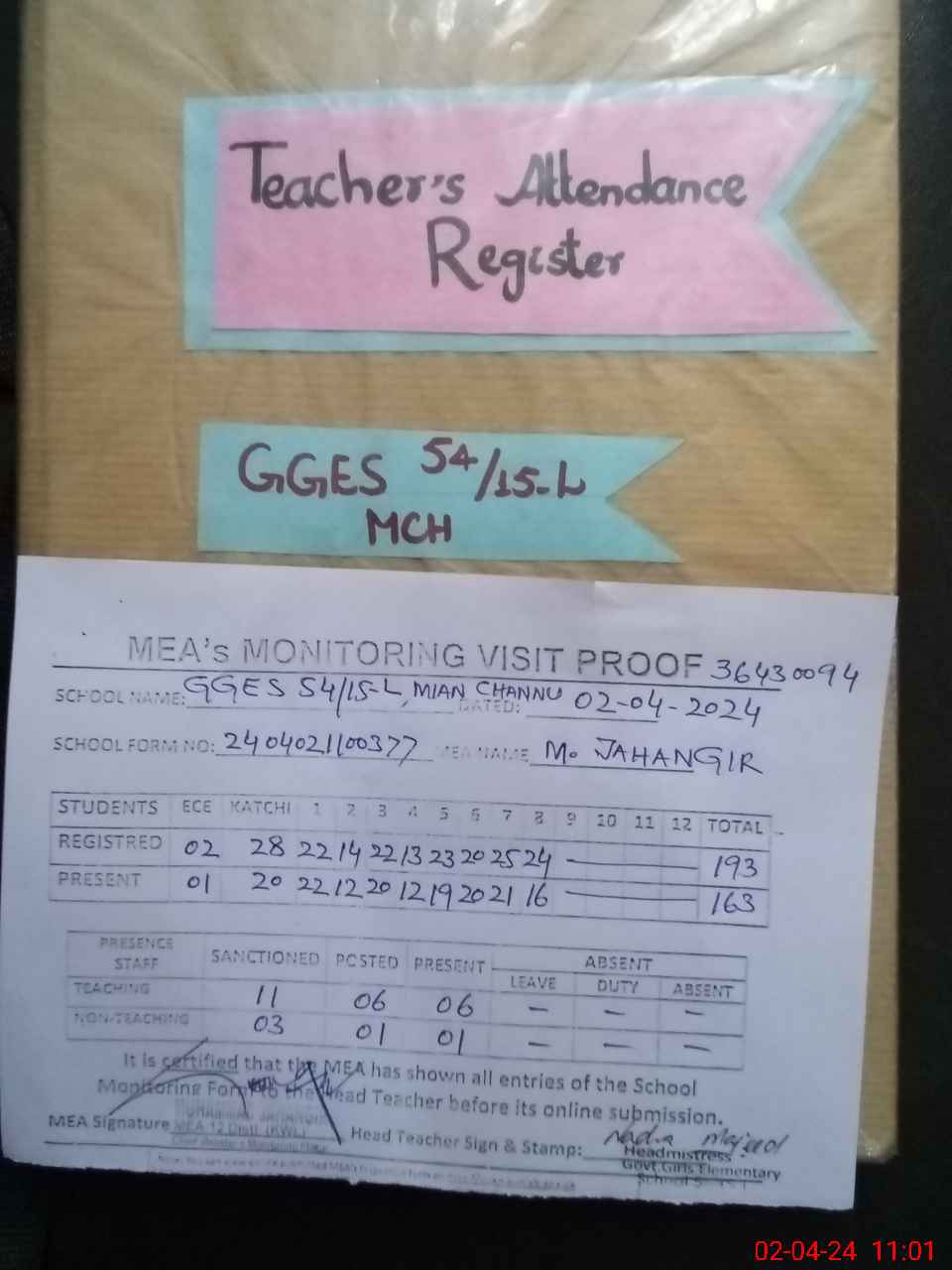 | Attendance Register | Head Teacher | MEA with School | Visit Proof |