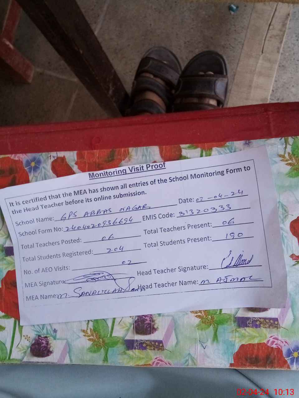 | Attendance Register | Head Teacher | MEA with School | Visit Proof |