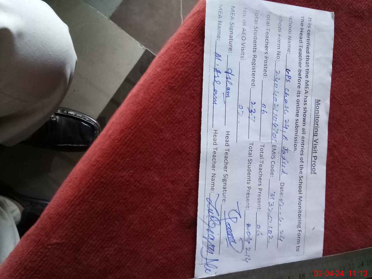 | Attendance Register | Head Teacher | MEA with School | Visit Proof |