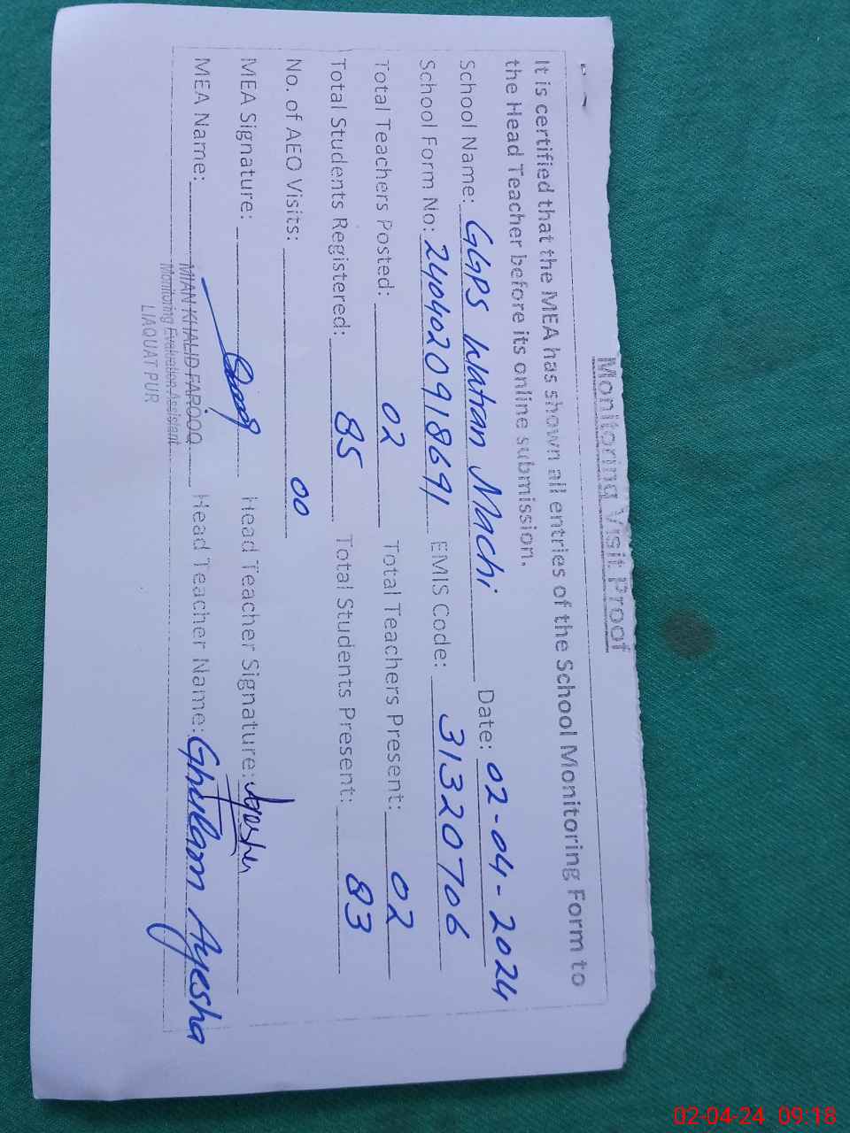 | EMIS Code: 31320706 | Name of School: GGPS WATRAN MACHEE | |||