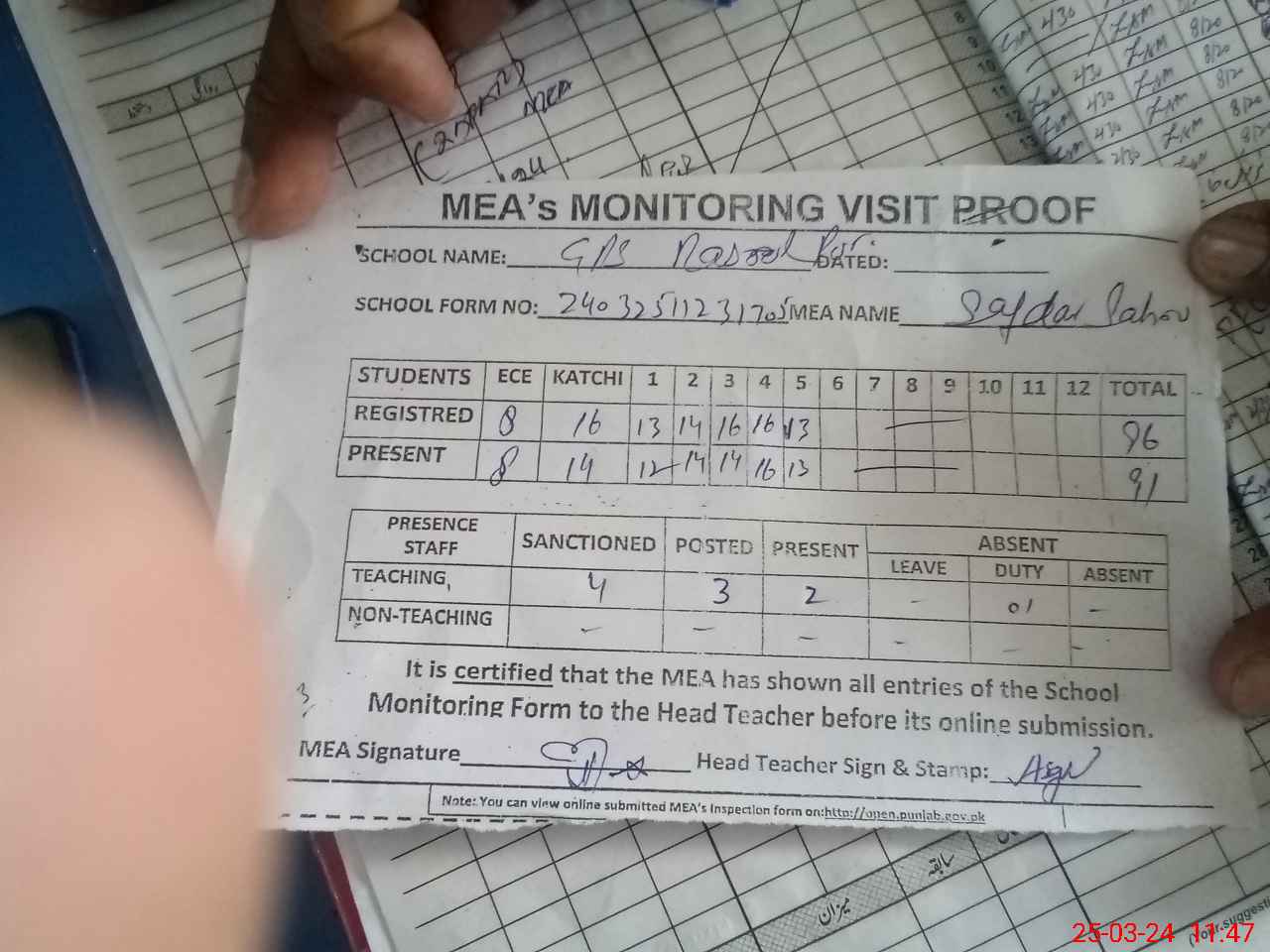 | Attendance Register | Head Teacher | MEA with School | Visit Proof |