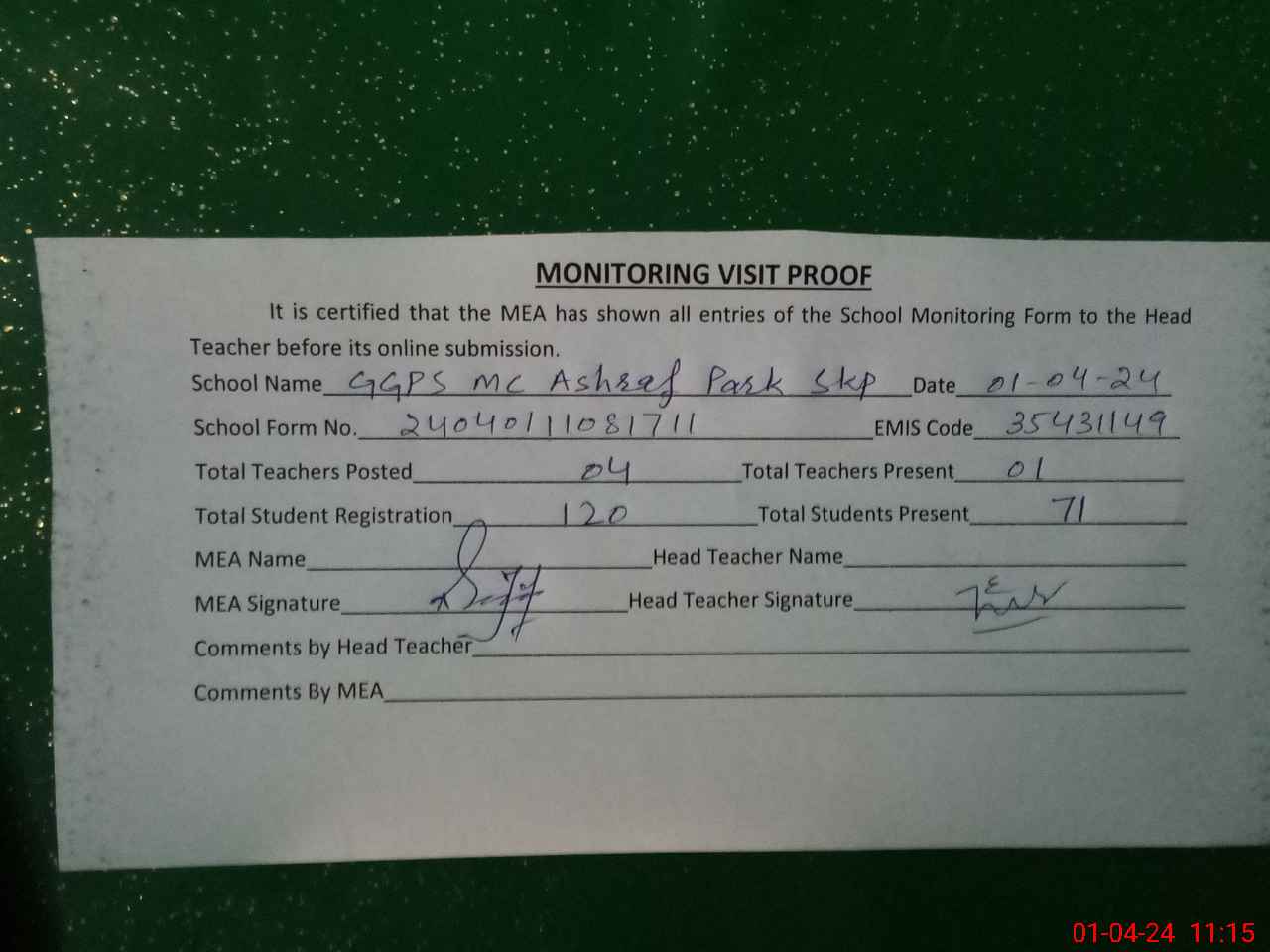 | EMIS Code: 35431149 | Name of School: GGPS MC ASHRAF PARK | |||