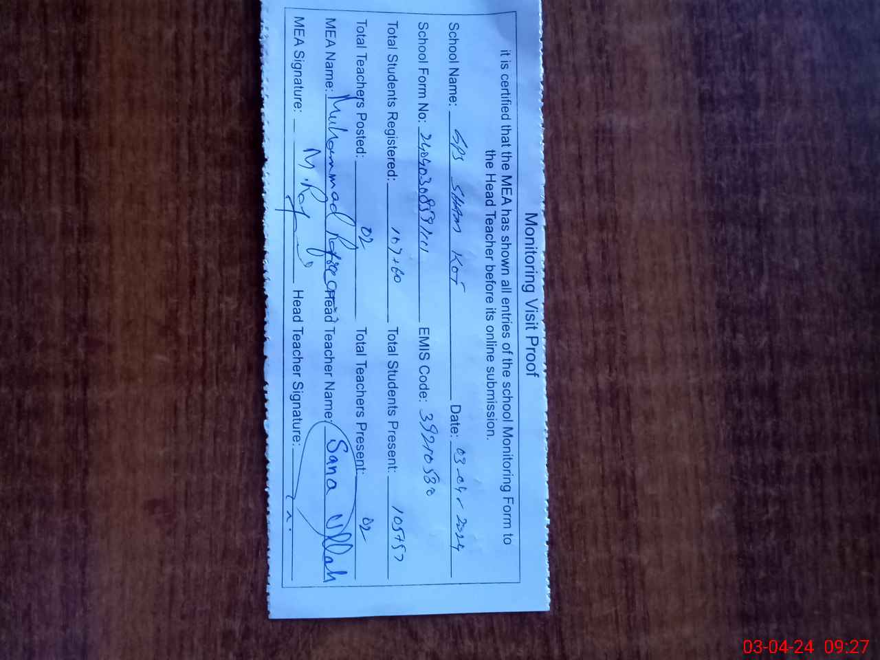 | Attendance Register | Head Teacher | MEA with School | Visit Proof |