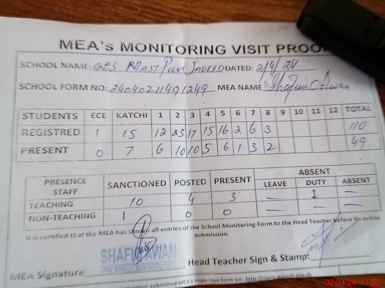 | EMIS Code: 36410176 | Name of School: GES MAST PUR JADEED, P/O BILAWAL PUR, KABIRWALA | |||