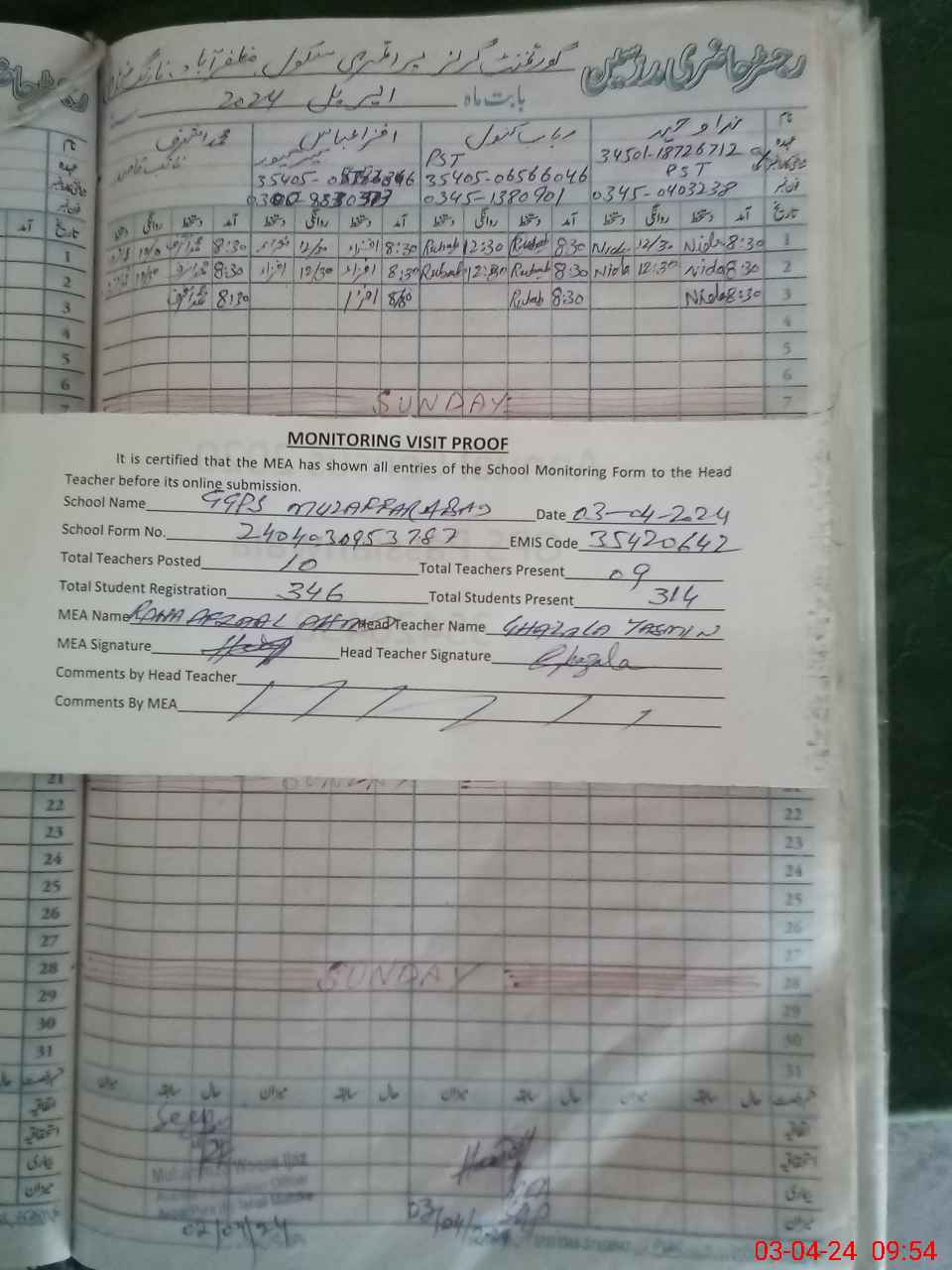 | Attendance Register | Head Teacher | MEA with School | Visit Proof |