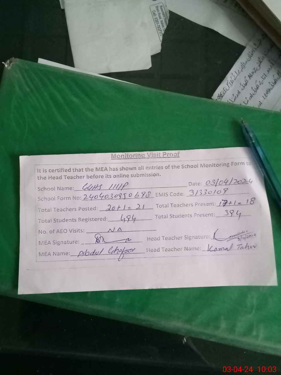 | Attendance Register | Head Teacher | MEA with School | Visit Proof |