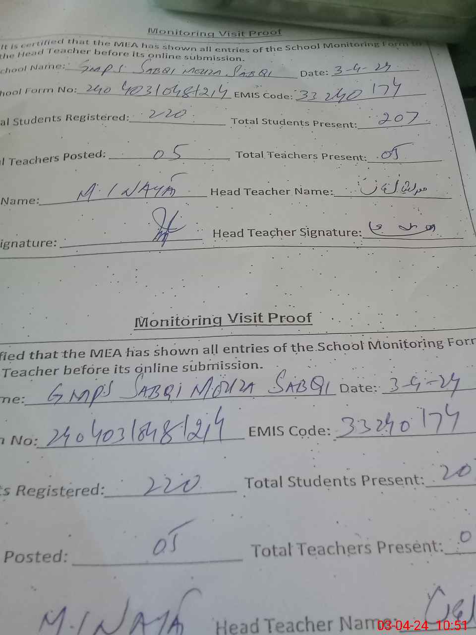 | Attendance Register | Head Teacher | MEA with School | Visit Proof |