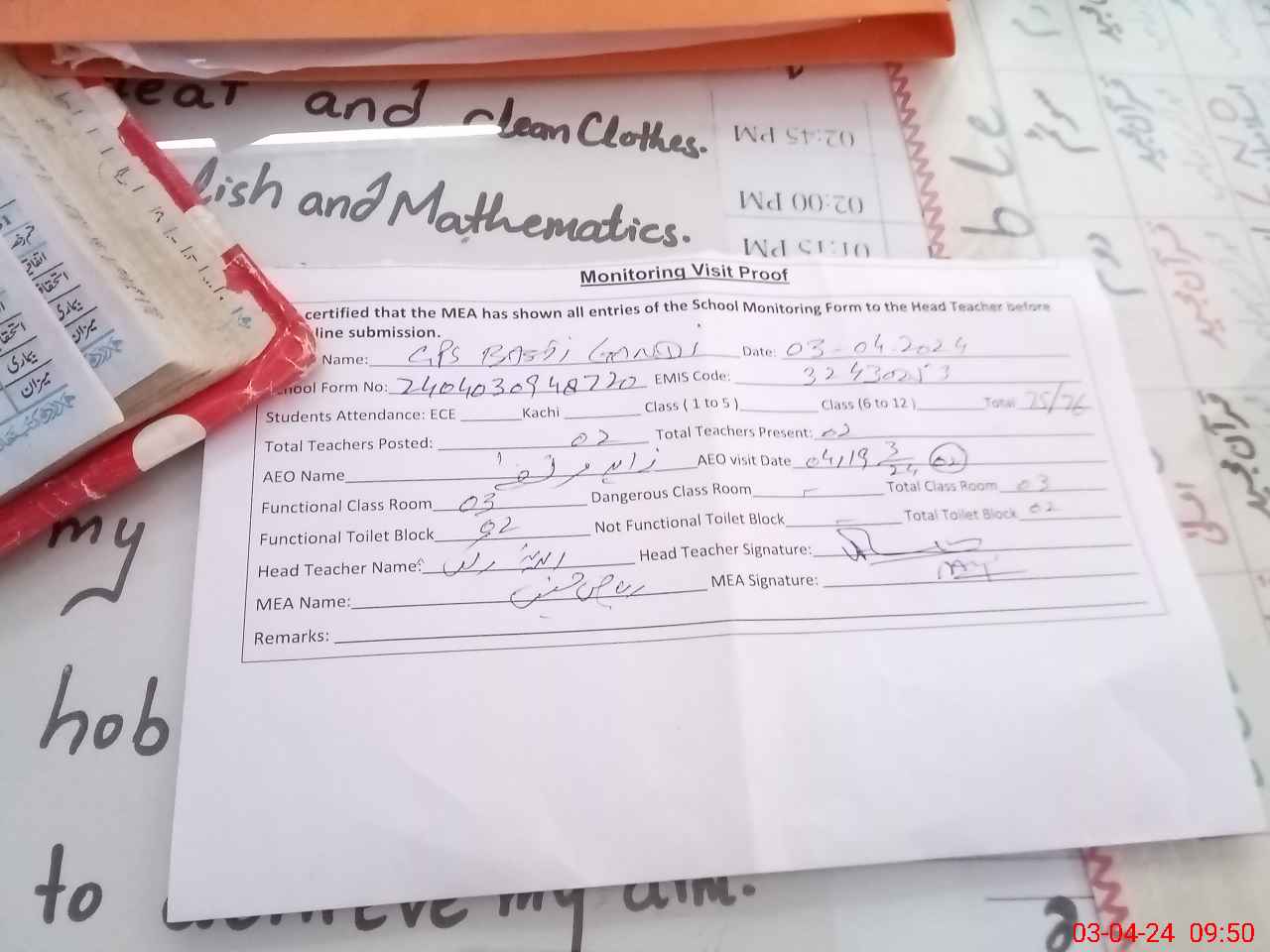 | Attendance Register | Head Teacher | MEA with School | Visit Proof |