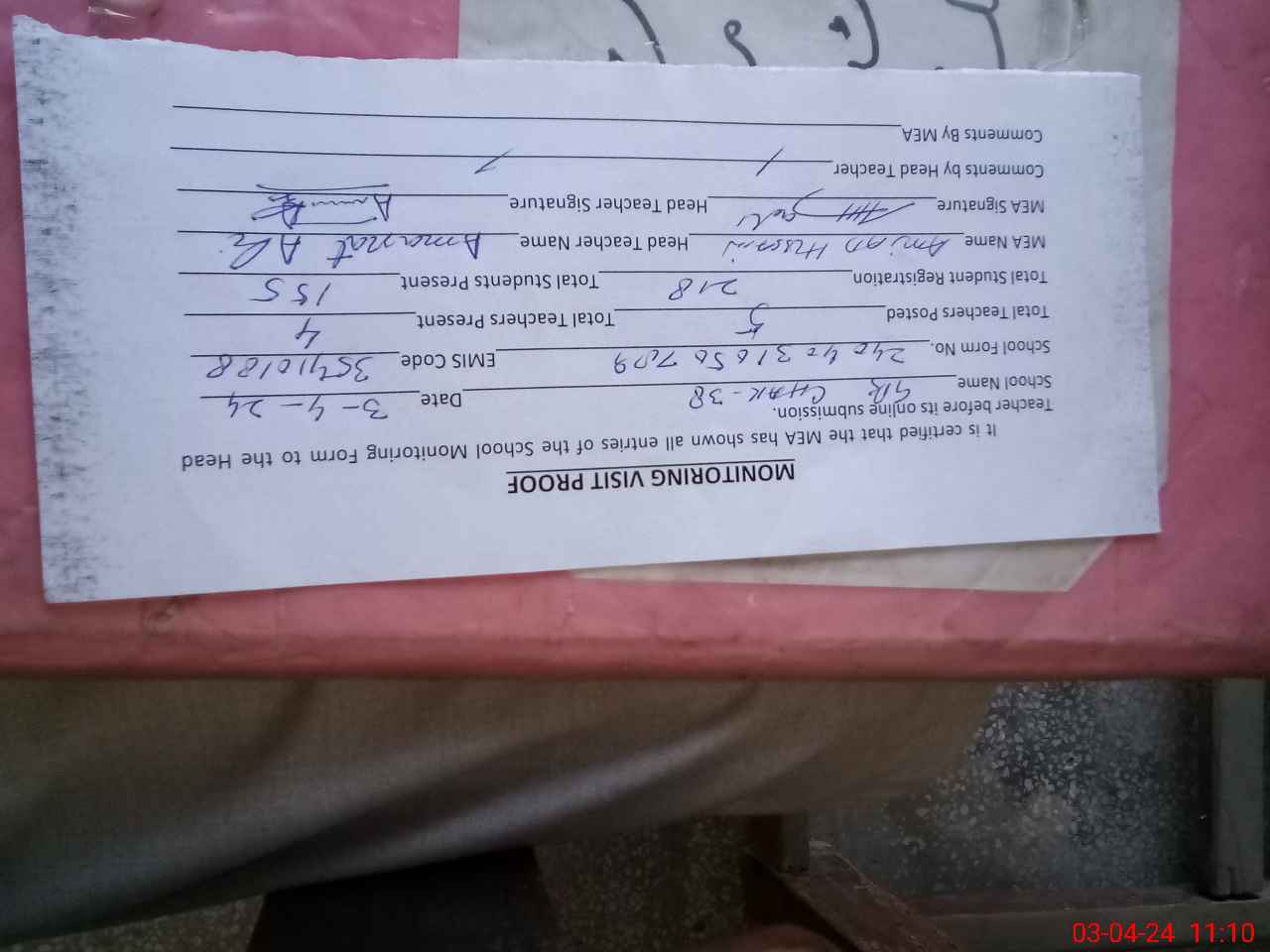 | Name: Am**** Al**** Designation: (School Headmaster's/Headmistress's) PTC/JV Phone/Cell Number: 03**** |