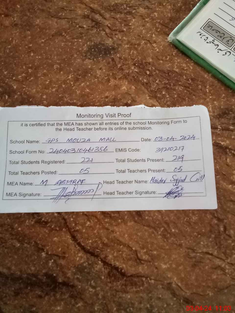 | EMIS Code: 39210217 | Name of School: GPS MOUZA MALL | |||