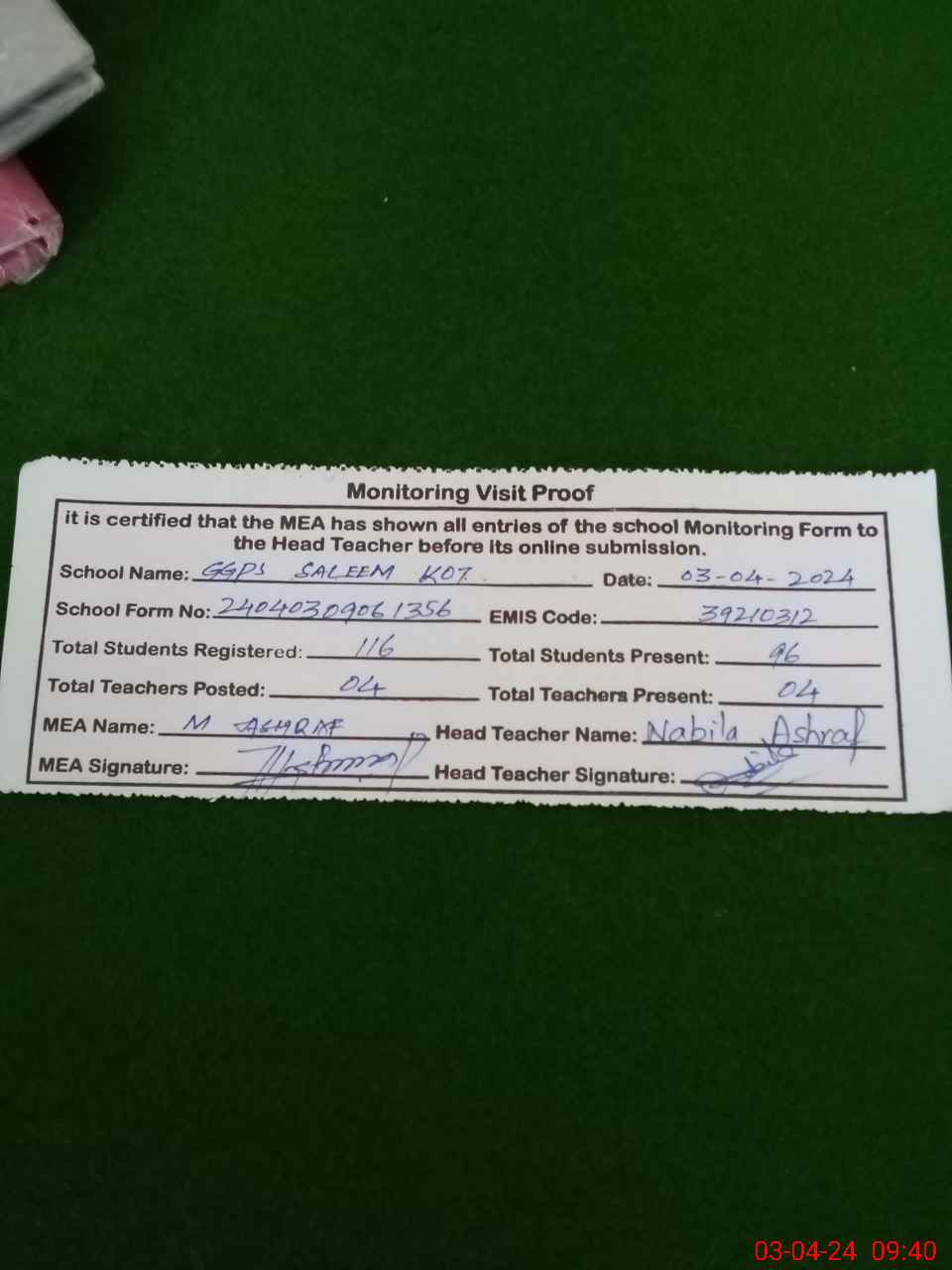 | EMIS Code: 39210312 | Name of School: GGPS SALEEM KOT | |||