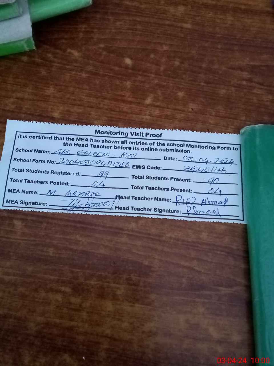 | Attendance Register | Head Teacher | MEA with School | Visit Proof |