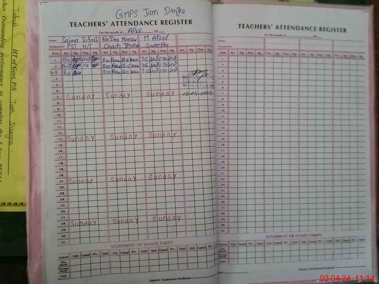 | Name: SA**** TU**** Designation: (School Headmaster's/Headmistress's) PST Phone/Cell Number: 03**** |