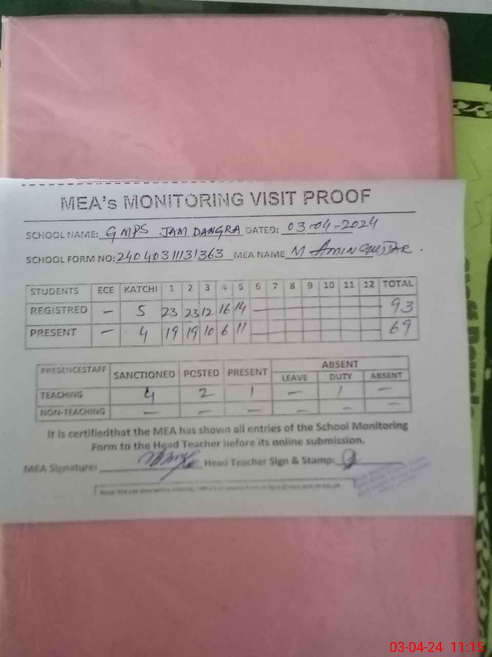 | Attendance Register | Head Teacher | MEA with School | Visit Proof |